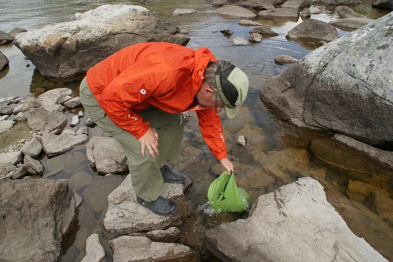 Below, scoop up water in the stuff sack. Gary Fujino took these pictures in the Wind River Range. This method is Gary's patented clothes washing method.